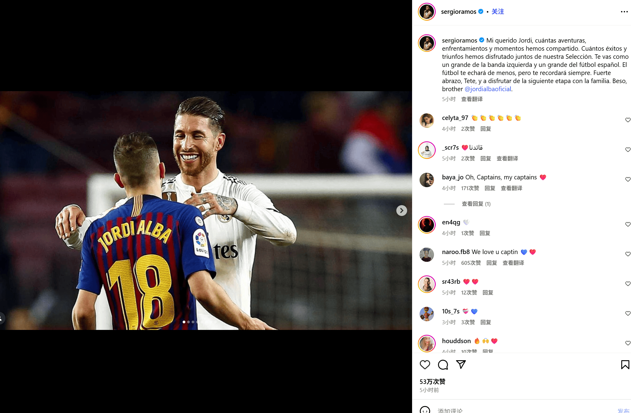 來源:Instagram虎撲10月08日訊 早前,約迪-阿爾巴更新社媒,自宣將在本賽季結(jié)束后退役。拉莫斯也更新了社交媒體,向阿爾巴送上了退役祝福。