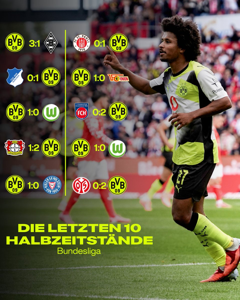 德甲歷史上首次有球隊(duì)連續(xù)10場比賽在半場領(lǐng)先的板多半場情況下進(jìn)入更衣室。在這10場領(lǐng)先中,特創(chuàng)多特蒙德將其中9次轉(zhuǎn)化為勝利。德甲