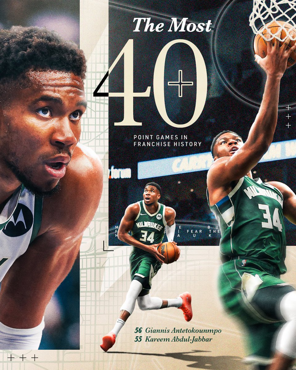雄鹿官方分享數(shù)據(jù):揚尼斯-阿德托昆博本場砍下41分,生涯第56次砍下40+,超越賈巴爾(55次)創(chuàng)下隊史新紀錄。