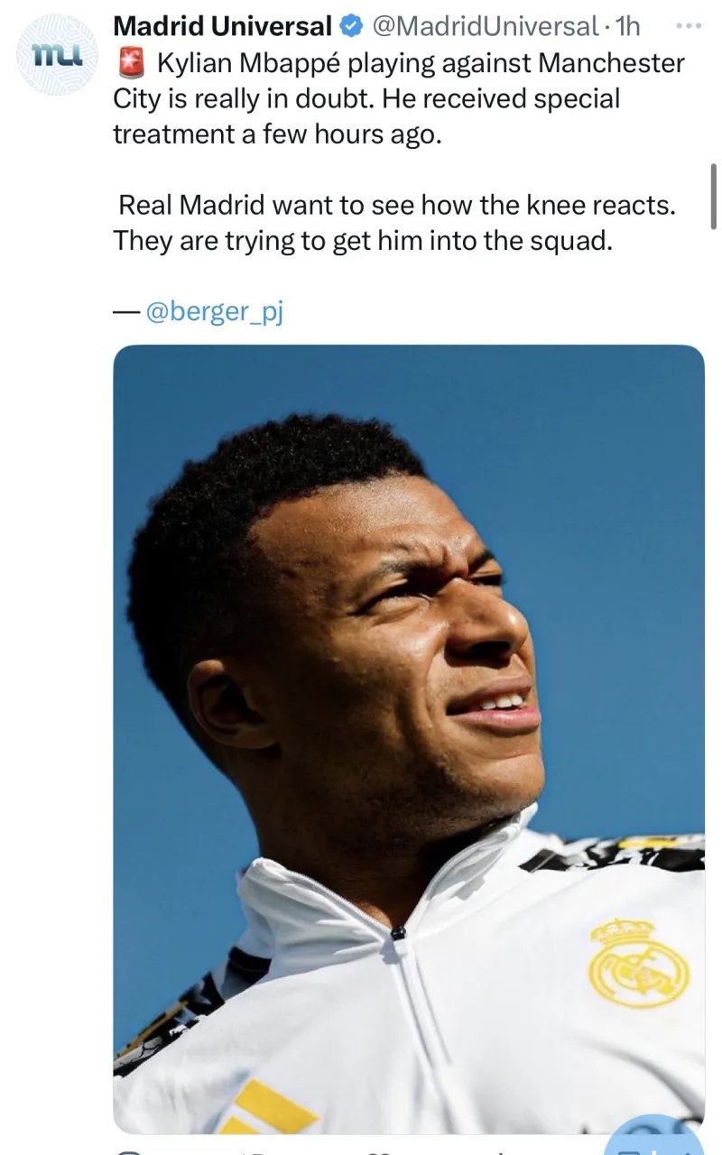 最新消息:姆總正在接受特殊治療,皇馬希望他明天能在大明單中!