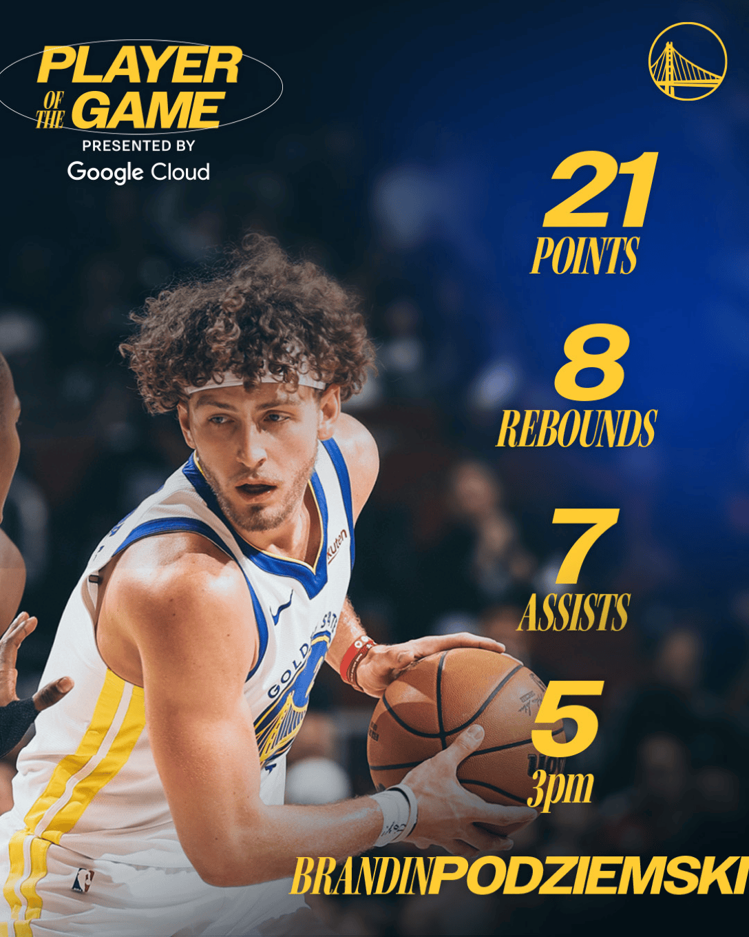 本場比賽,勇士球員布蘭丁-波杰姆斯基出戰(zhàn)28分鐘,13投7中,其中三分球9投5中,罰球2投2中,得到21分8籃板7助攻2搶斷。