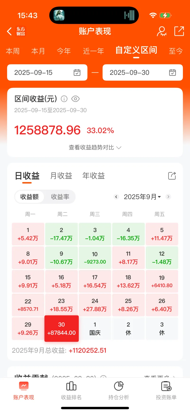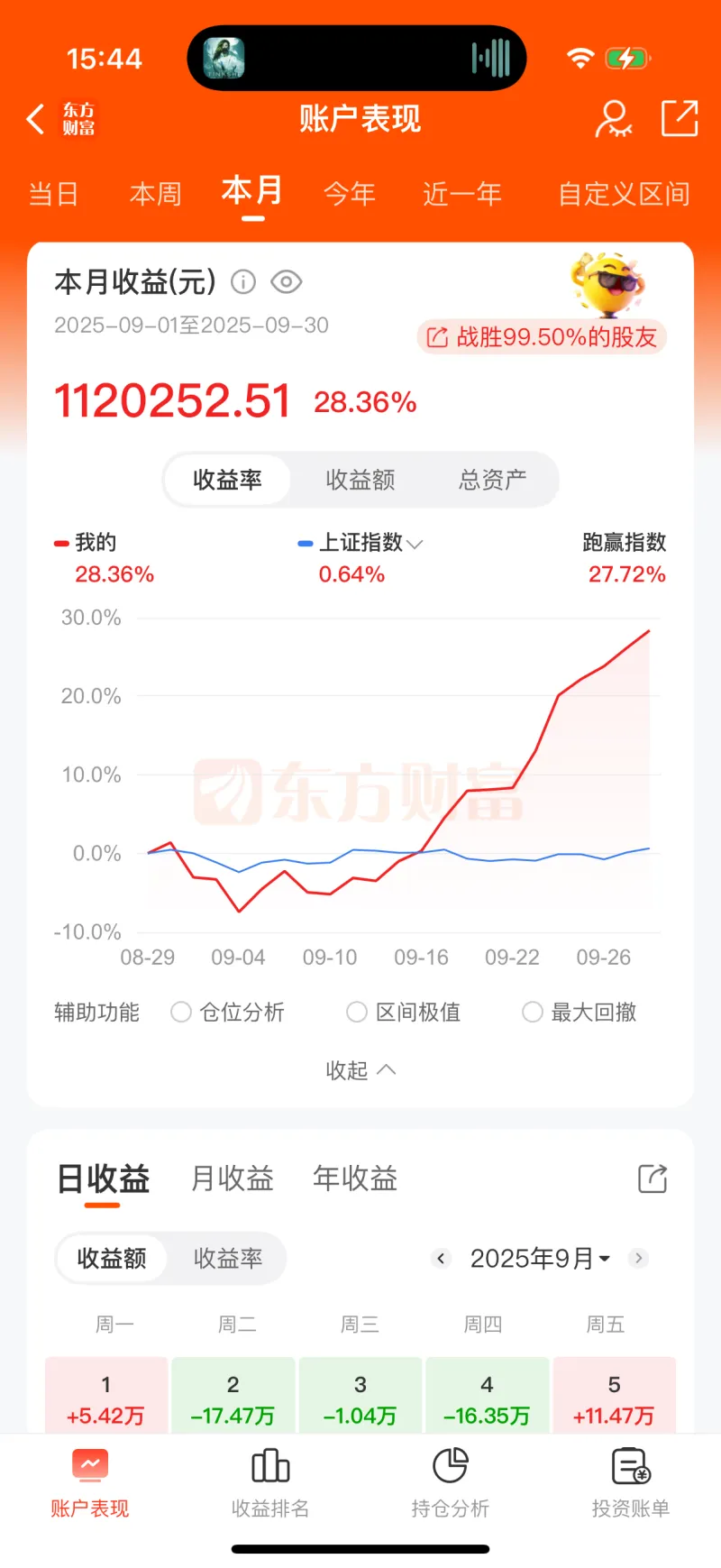 本月收益率28.36%(盈利112w),超額達成計劃的15%的目標計劃,在這個金秋時節(jié)也算是豐收了。9月份前4天要吐了,4天虧了7.5%(-30w),確實讓人難頂。還好后面的日子一路高歌猛進后面18個交易日殺回來142w,個人覺得這個過程還蠻有意思的。有一種上戰(zhàn)場的感覺,在滑鐵盧后扭轉(zhuǎn)乾坤真的很痛快。