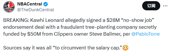 配文:“科懷-倫納德涉嫌與一家欺詐性植樹公司簽訂2800萬美元的"掛名職位"代言協(xié)議,而該公司實(shí)際由快船老板史蒂夫-鮑爾默秘密注資5000萬美元。消息人士稱,此舉完全是為了"規(guī)避工資帽"。”