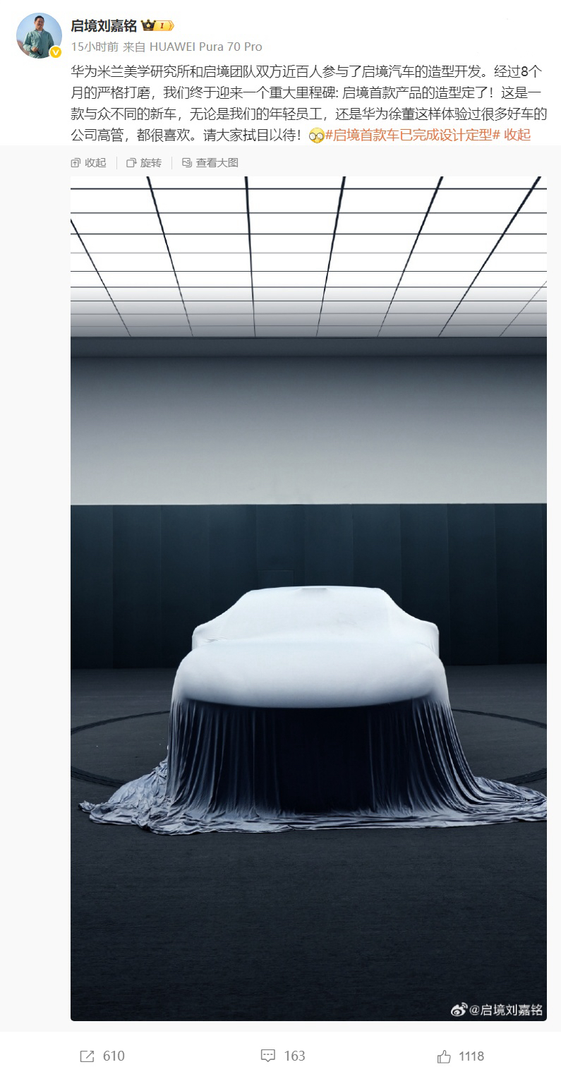 虎撲10月16日訊 啟境汽車 CEO 劉嘉銘昨天在微博發(fā)文宣布:旗下首款車型已完成設(shè)計(jì)定型。據(jù)其介紹,這是一款與眾不同的新車,“無(wú)論是我們的年輕員工,還是華為徐董這樣體驗(yàn)過(guò)很多好車的公司高管,都很喜歡。”