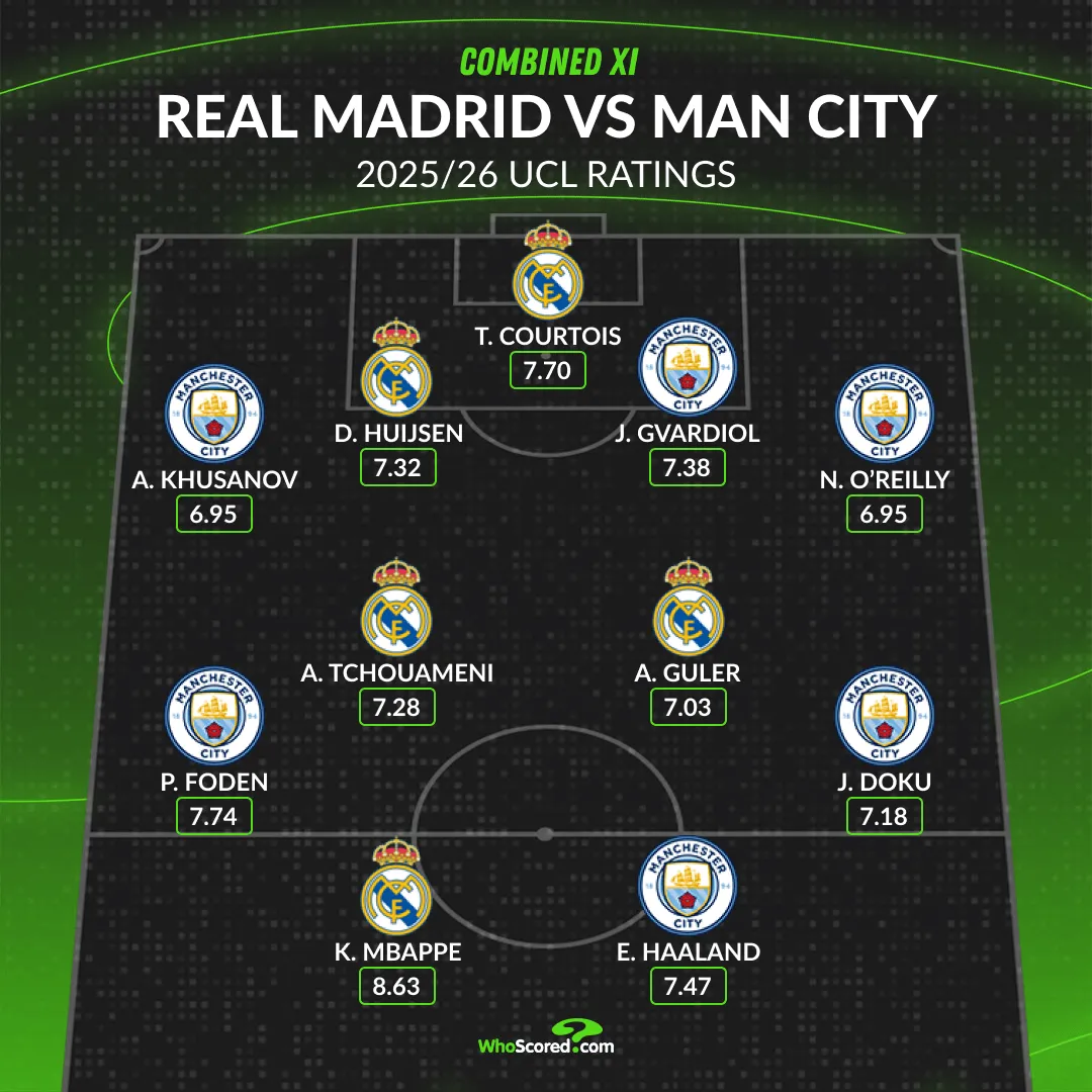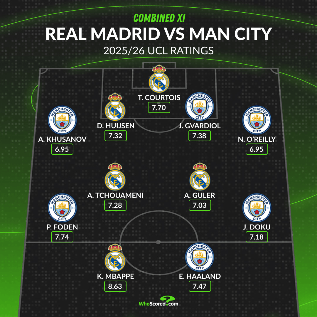 虎撲12月10日訊 本輪歐冠焦點(diǎn)戰(zhàn),皇馬主場(chǎng)對(duì)陣曼城。賽季賽前WhoScored盤(pán)點(diǎn)本賽季歐冠兩隊(duì)合體評(píng)分最高陣容: