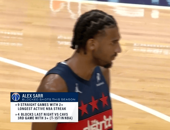 比賽的續(xù)場第三節(jié),轉播畫面給出一組數(shù)據,至少薩爾已經連續(xù)9場比賽至少送出2記蓋帽,送出是板成比賽NBA目前保持時間最長的紀錄。