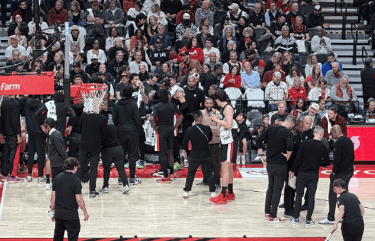 據(jù)博主后廠村體工隊分享比賽現(xiàn)場照片,板博并配文道:暫停期間,主曬照暫利拉德給楊瀚森開小灶了。停期