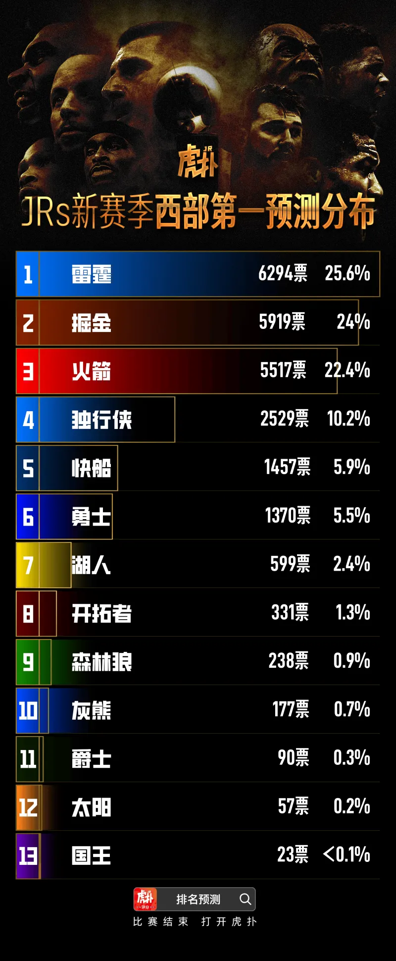 此外,我們還整理出了各位JRs對(duì)新賽季東西部頭名的選擇,其中西部第一各隊(duì)獲得的選票如下: