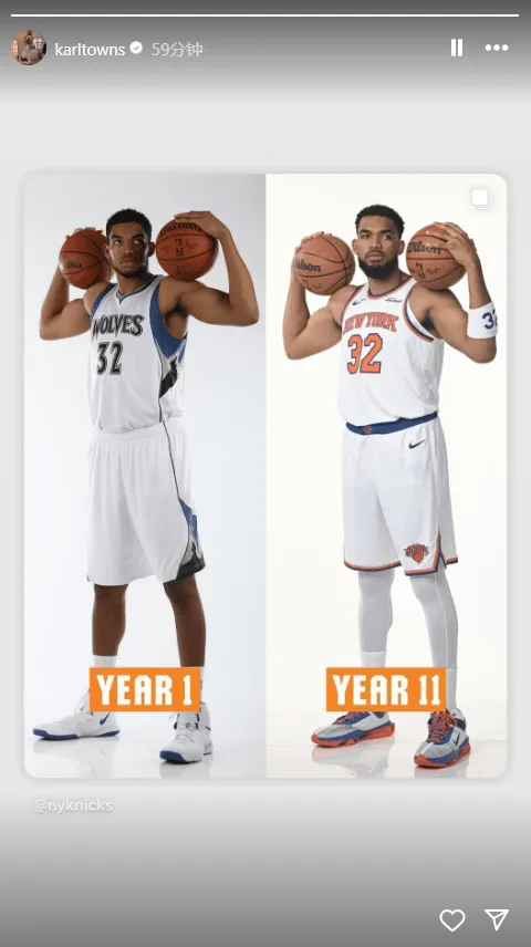 虎撲09月26日訊 今日,卡爾-安東尼-唐斯更新個人社交媒體,曬出曬出了一張自己從新秀第一年到第十一年擺出相同姿勢的自己定妝照。