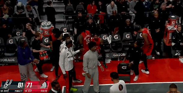 第三節(jié)比賽中,松突手掛凱爾登輕松突破雙手掛框暴扣,破雙馬刺領先10分打停開拓者。刺領