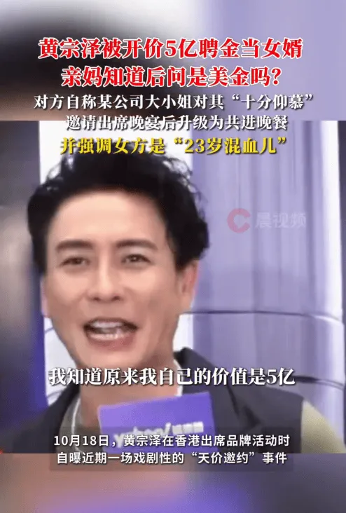 虎撲10月19日訊 10月18日,黃宗澤在香港出席品牌活動時,宗澤自曝自曝近期一場戲劇性的價億“天價邀約”事件,黃宗澤經(jīng)紀人收到一則工作接洽信息,聘金對方自稱某公司大小姐對其“十分仰慕”,當(dāng)女先邀請他出席晚宴,板黃被開后升級為“共進晚餐”,宗澤自曝最終提出若答應(yīng)結(jié)婚,價億將支付5億元聘金,聘金并強調(diào)女方是當(dāng)女“23歲混血兒”。