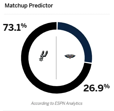賽前,日比美媒ESPN預(yù)測本場比賽,賽馬馬刺勝率73.1%,鶘勝鵜鶘勝率26.9%。