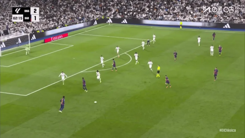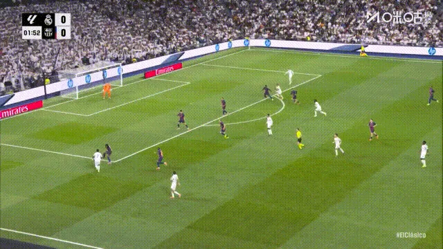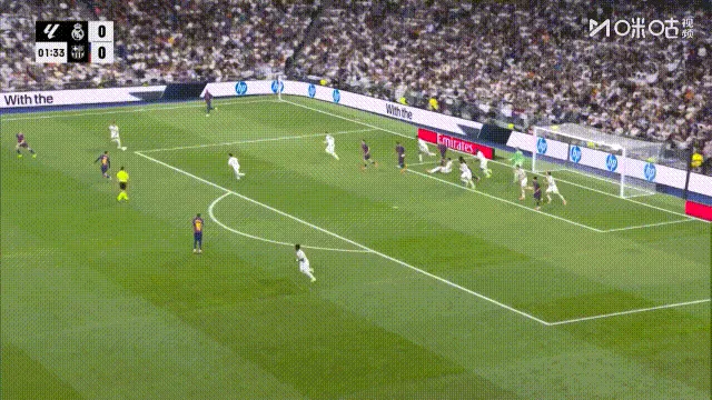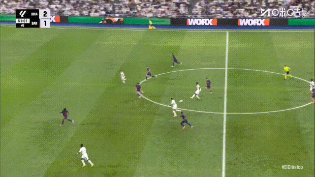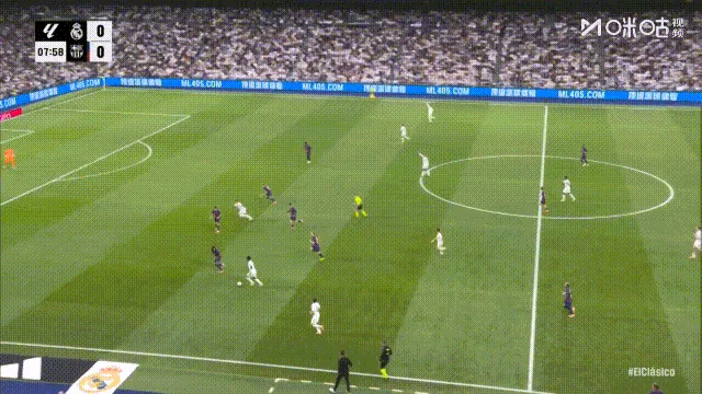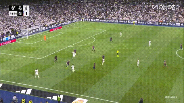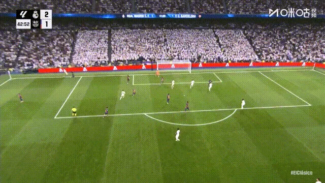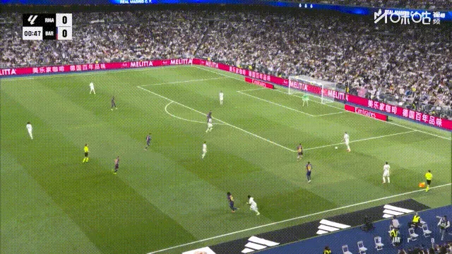 42分簡(jiǎn)單下底傳中右后衛(wèi)前壓沒速度追不上,右后腰不前頂讓右邊鋒協(xié)防,左后衛(wèi)左中衛(wèi)沒高點(diǎn)被頭球回做破空門,此時(shí)德容經(jīng)典跟著球空跑,放空自己盯防的貝林厄姆
