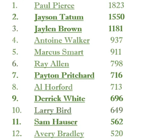 本場過后,普里查德在凱爾特人至今已經(jīng)投進(jìn)716記三分球,他超越艾爾-霍福德,排在凱爾特人隊(duì)史第7。