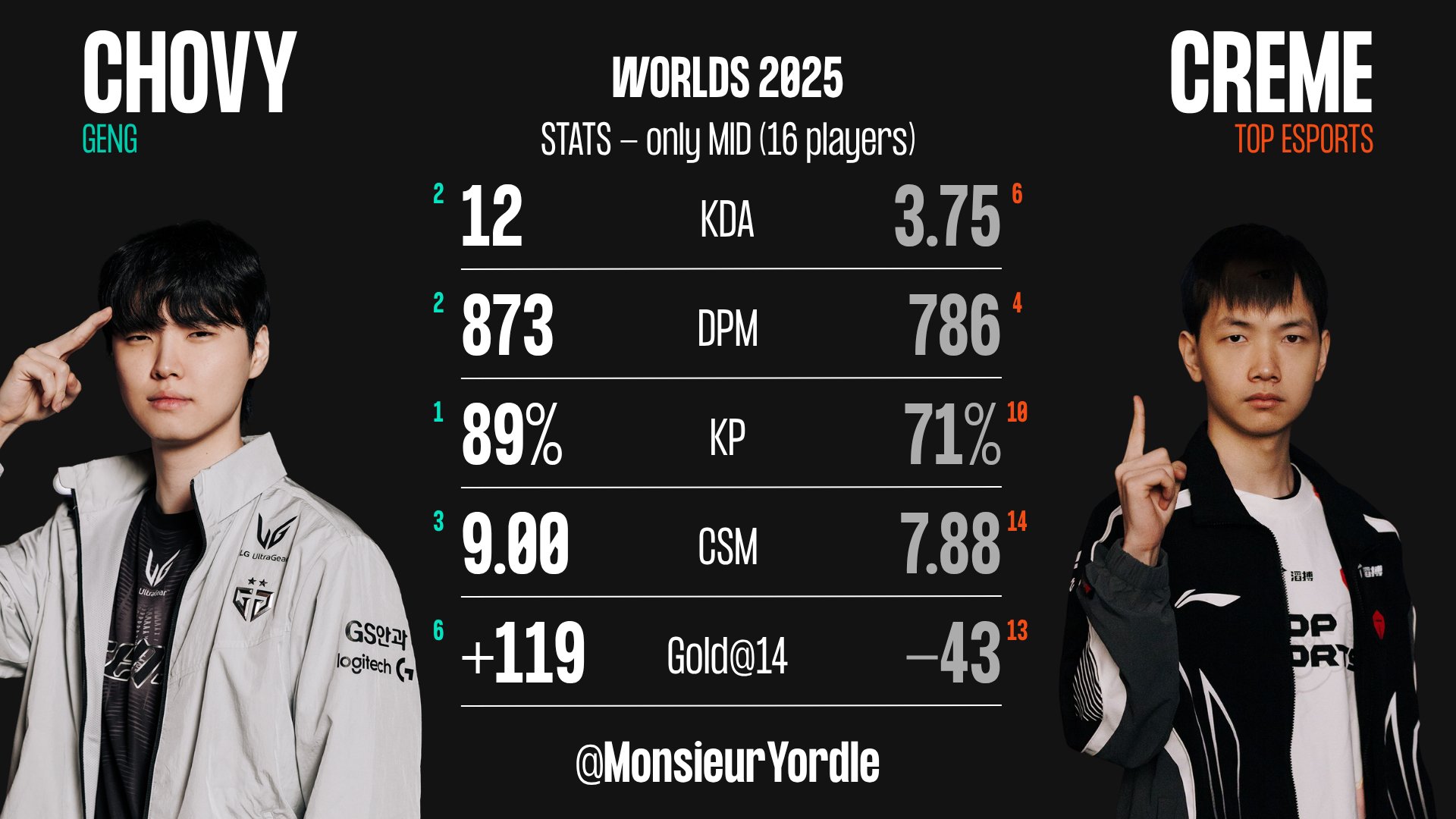 虎撲10月23日訊 今日外媒統(tǒng)計(jì)TES與GEN中單數(shù)據(jù)對(duì)比,Creme在KDA、板外比分均傷害、媒統(tǒng)參團(tuán)率、計(jì)T據(jù)對(duì)分均補(bǔ)刀、單數(shù)14分鐘經(jīng)濟(jì)差均落后于Chovy。全面