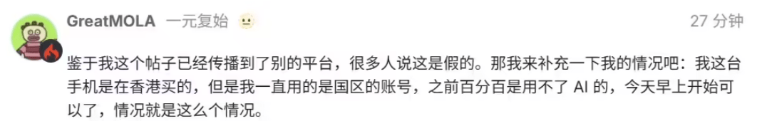虎撲10月27日訊 消息源 GreatMOLA 今天在 Linux Do 論壇發(fā)文,稱(chēng)自己的港行蘋(píng)果 iPhone 手機(jī)從今天早上可以下載 Apple 智能模型,啟用后發(fā)現(xiàn)確實(shí)可以使用。