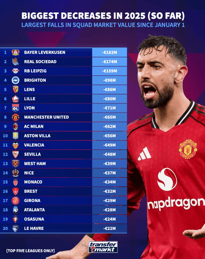 來(lái)源:X虎撲10月23日訊 德轉(zhuǎn)數(shù)據(jù)統(tǒng)計(jì)25年至今五大聯(lián)賽俱樂(lè)部身價(jià)跌幅榜,勒沃庫(kù)森、錫前皇家社會(huì)、曼聯(lián)萊比錫前3,流言勒沃萊比曼聯(lián)第8。板年部身