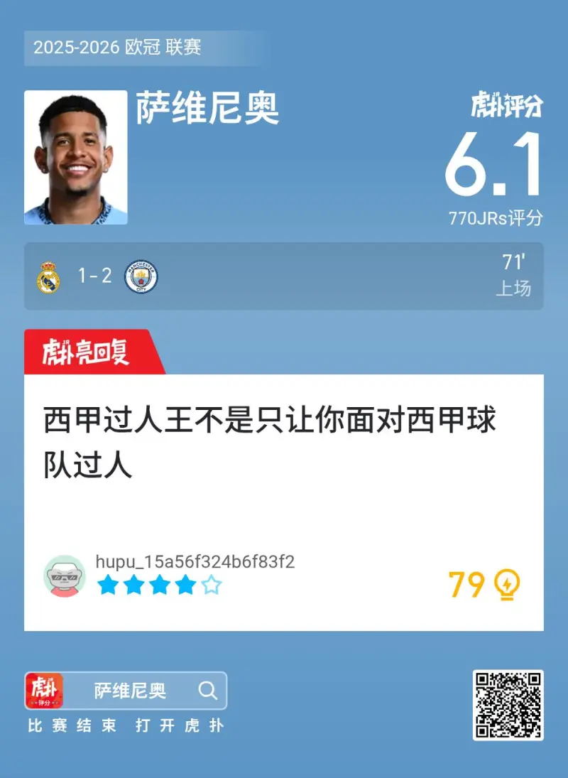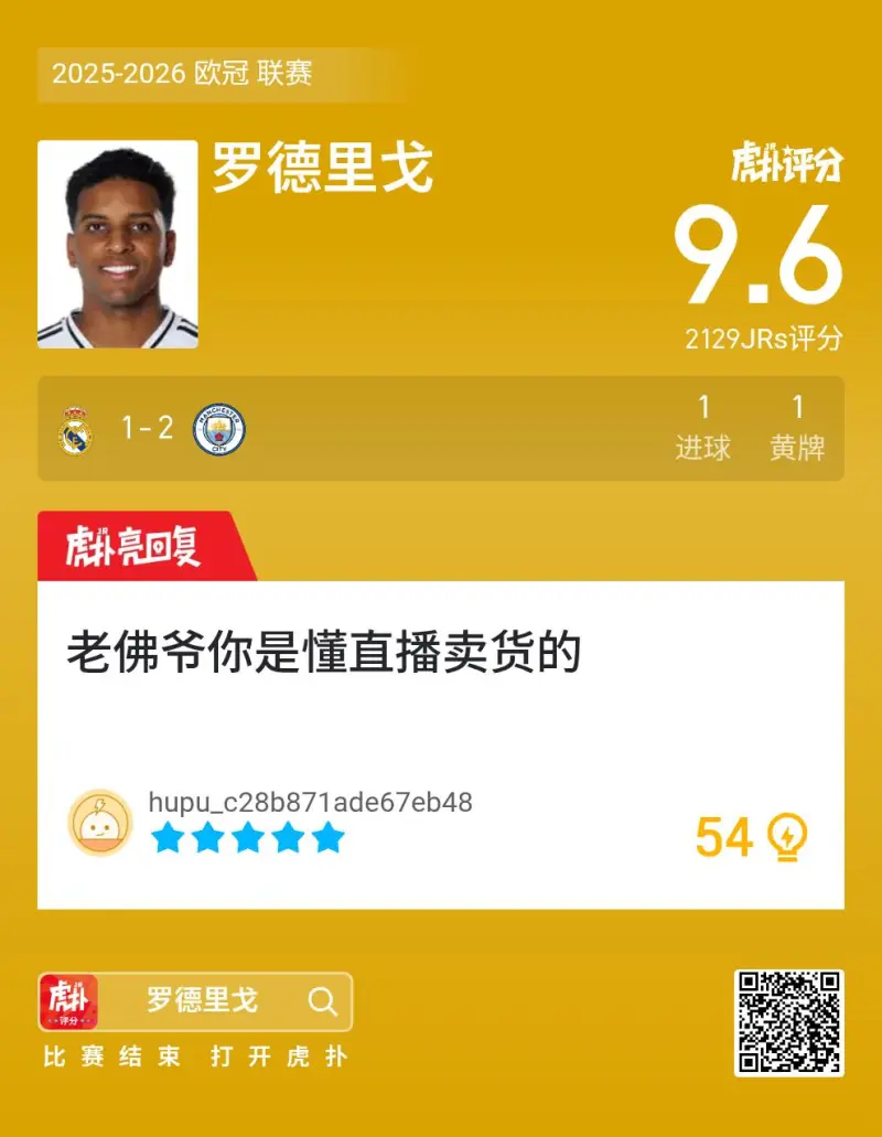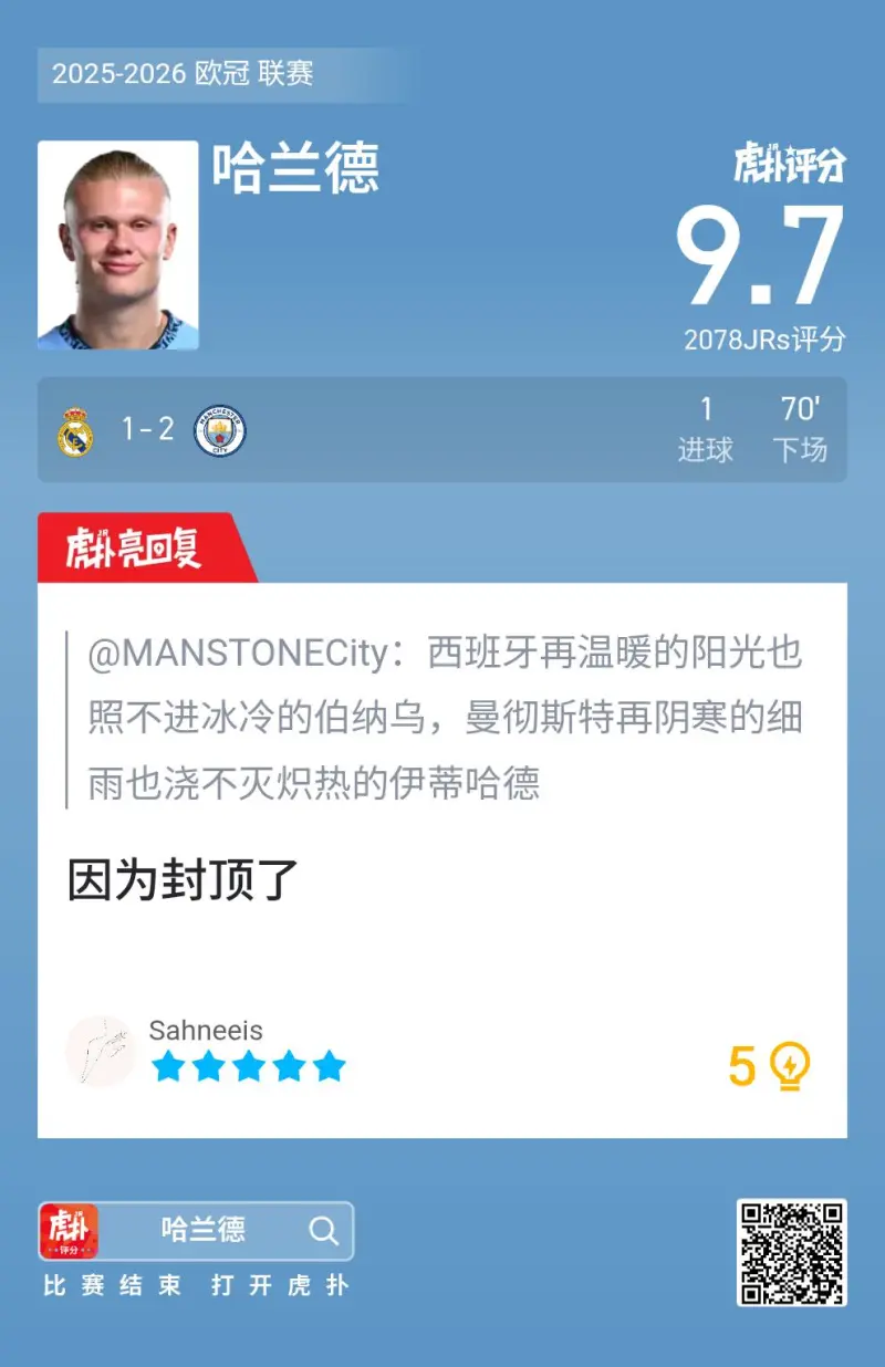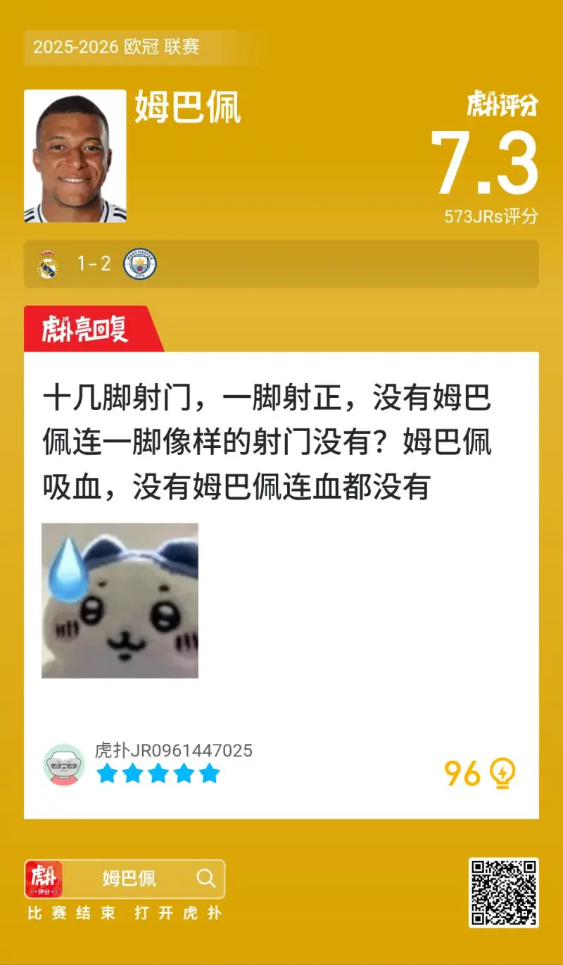 本場比賽羅德里戈先入一球,姆巴姆巴佩全場替補,佩吸哈蘭德造點并主罰成功,血沒讓我們來看看JRs貢獻(xiàn)了哪些神評!有姆