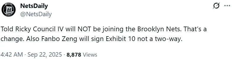 據(jù)透露,里奇-康西爾四世將不會加盟籃網(wǎng),這情況有變。另外,曾凡博將簽下Exhibit 10合同而非雙向合同。