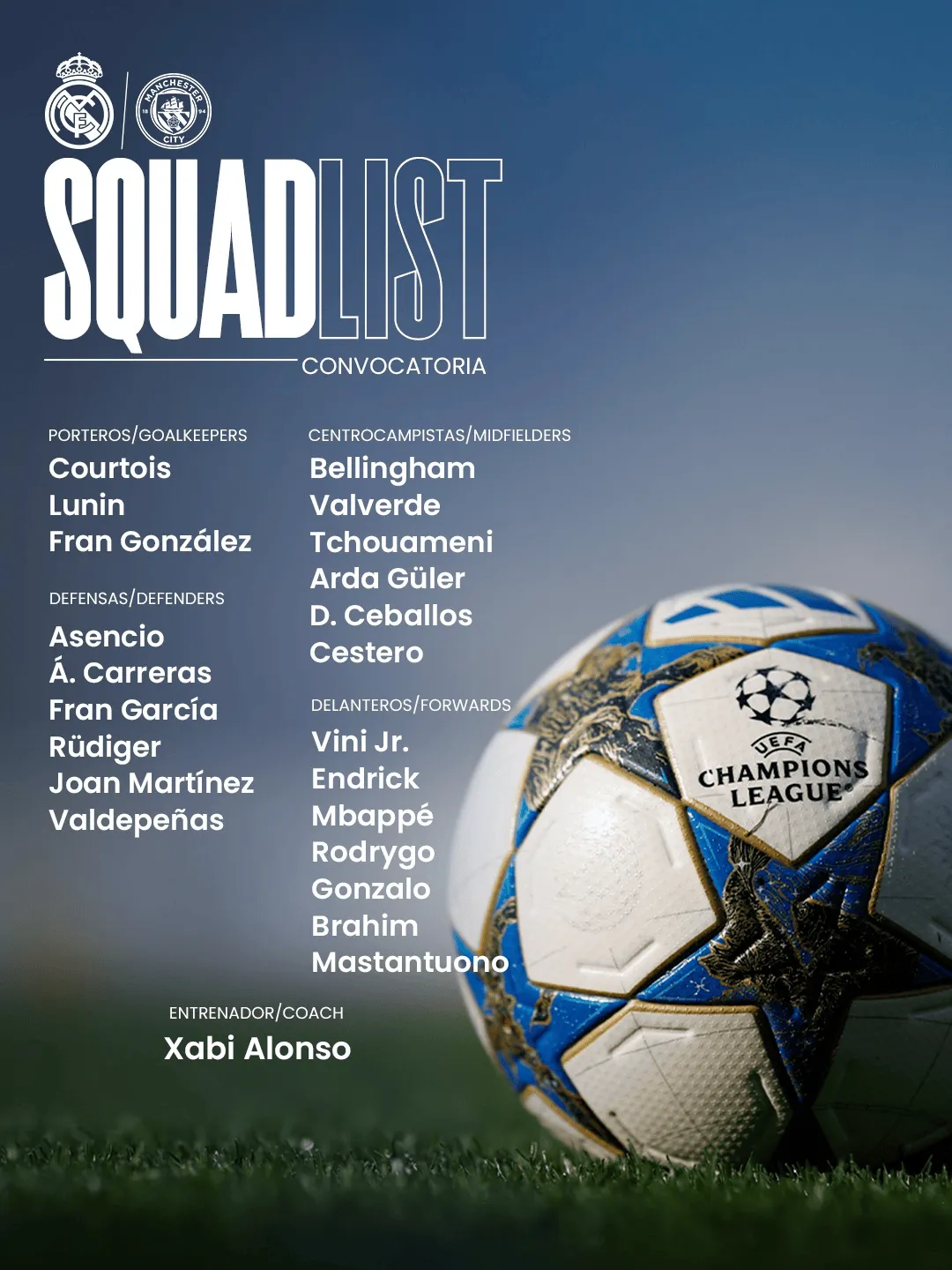 虎撲12月10日訊 北京時(shí)間12月11日凌晨4時(shí),2025-26賽季歐冠聯(lián)賽階段第6輪,皇家馬德里坐鎮(zhèn)伯納烏球場迎戰(zhàn)曼城。賽前皇馬公布了本場比賽的大名單。