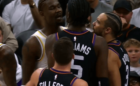 比賽第四節(jié),開艾馬威頂開艾頓打成2+1,頓打隨后兩人在籃下發(fā)生口角。成隨