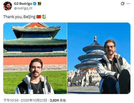 虎撲10月23日訊 G2分析師Rodrigo曬在天壇游玩照片:謝謝你,北京!壇游??