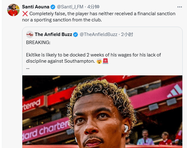虎撲09月25日訊 法國(guó)媒體Foot Mercato首席記者Santi Aouna否認(rèn)利物浦跟隊(duì)的報(bào)道。