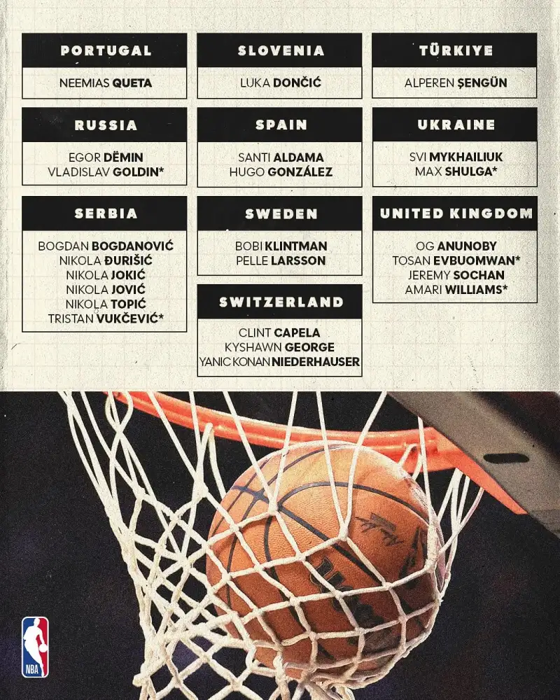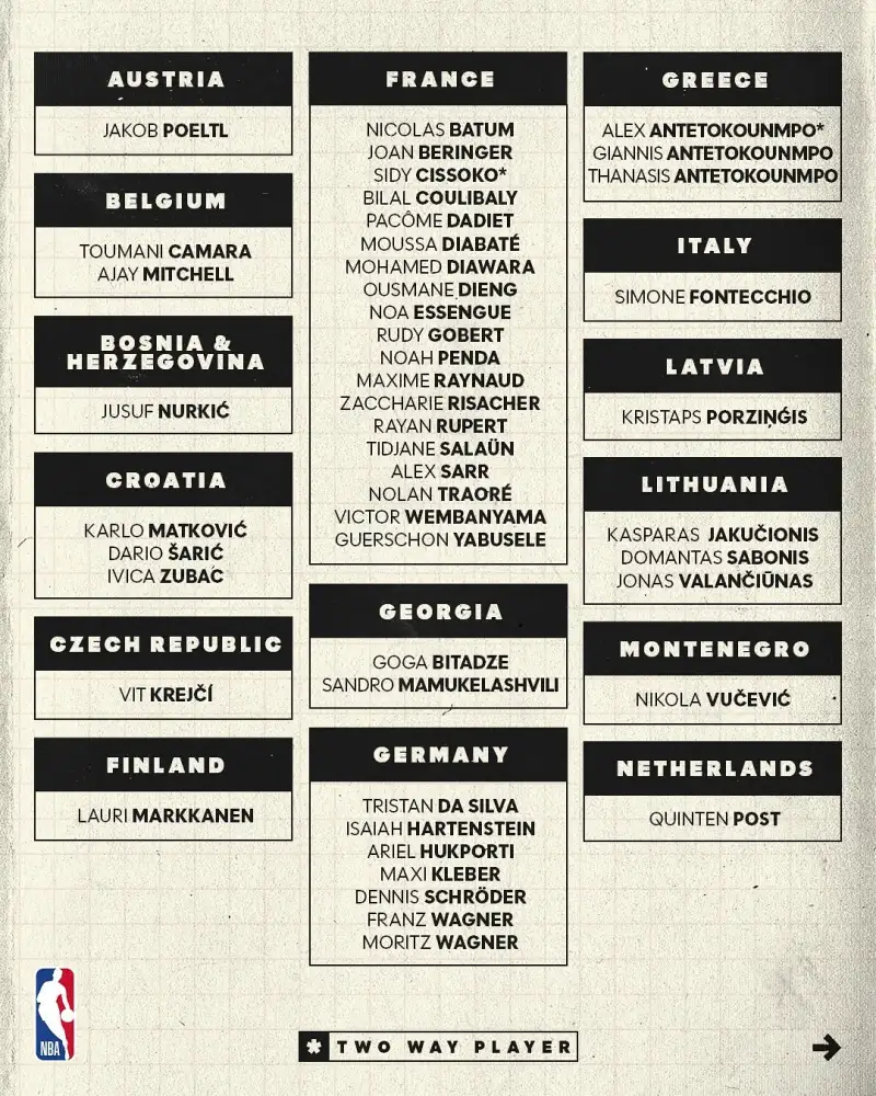 來源:Instagram虎撲10月22日訊 NBA歐洲官方社媒曬出數(shù)據(jù),25-26賽季將會有多達71位來自歐洲不同國家和地區(qū)的自歐洲的征戰(zhàn)球員征戰(zhàn)NBA,創(chuàng)造新的創(chuàng)新記錄記錄。