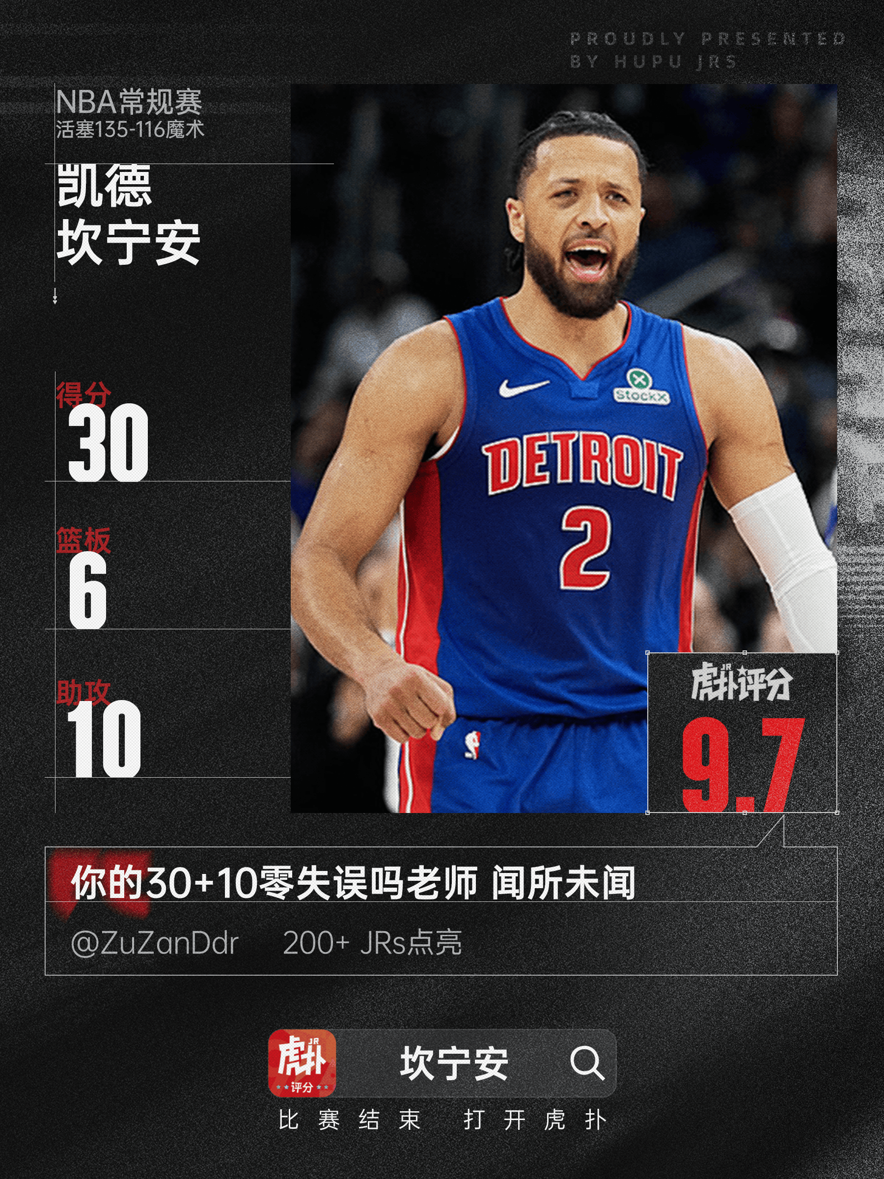 本場比賽,下分活塞球員凱德-坎寧安出戰(zhàn)35分鐘,籃板24投12中,助攻其中三分球7投1中,搶斷罰球5投5中,封蓋得到30分6籃板10助攻3搶斷3封蓋。坎寧