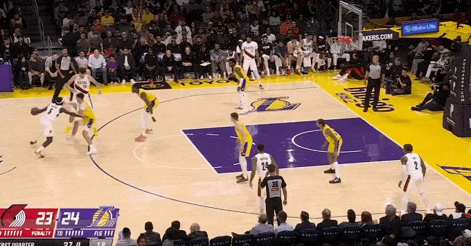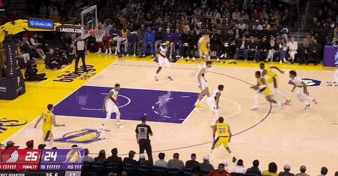 NBA常規(guī)賽,湖人對陣開拓者的朗尼比賽正在進(jìn)行中。