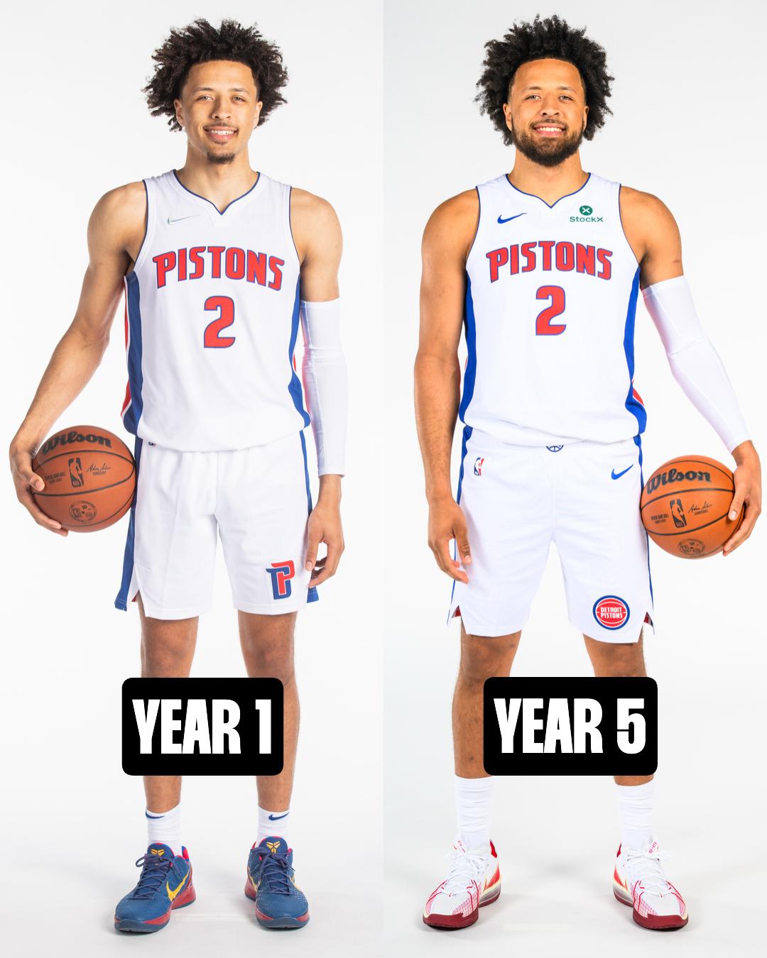 虎撲10月04日訊 活塞官方更新X,曬出一張活塞球員凱德-坎寧安的塞官定妝對(duì)比照與球迷分享。