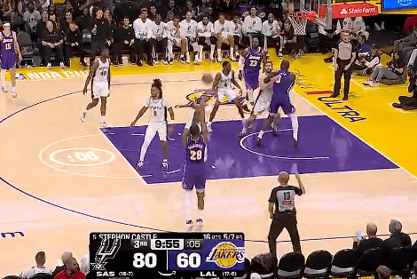 NBA杯四分之一決賽,湖人對陣馬刺的進分接球比賽正在進行中。