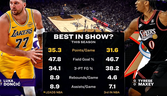 比賽第二節(jié),場均轉(zhuǎn)播鏡頭給出東契奇和馬克西的西分?jǐn)?shù)據(jù):