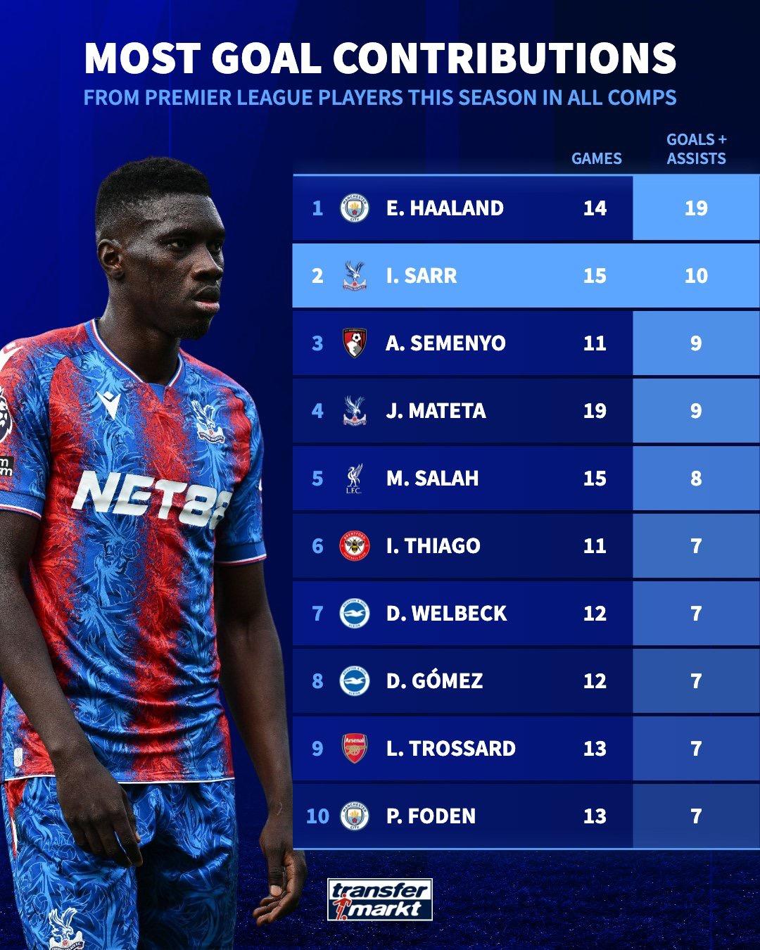 哈蘭德以14場(chǎng)參與19球高居榜首,季英水晶宮的超球參進(jìn)層領(lǐng)薩爾以15場(chǎng)參與10球排名第二。