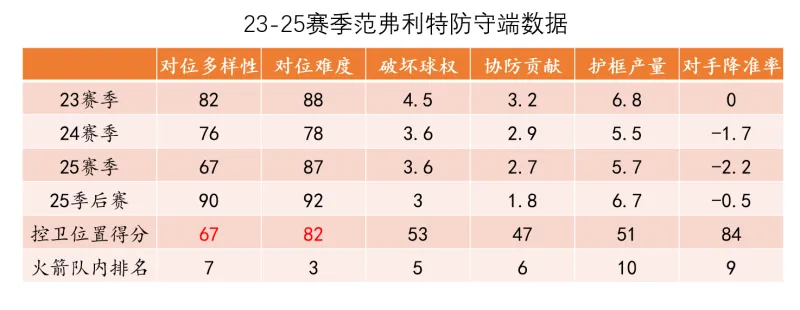 總結(jié):范弗利特在火箭隊中的作用并非傳統(tǒng)的持球后衛(wèi),靠出色的進攻威脅來為自己和隊友創(chuàng)造機會。上賽季范弗利特球權(quán)大降,進攻端主要的任務是順利把球過渡到攻堅核心申京手中、大大減少球隊的整體失誤率,同時為球隊提供不錯的空間價值,其三分牽制力非常出色。而他作為一名控衛(wèi)在防守端具有很好的領(lǐng)防和換防價值才是烏度卡如此信任他的核心原因,無論常規(guī)賽還是季后賽他的場均時間都是隊內(nèi)第1,足以可見要想替代老范的作用是件很難的事情!