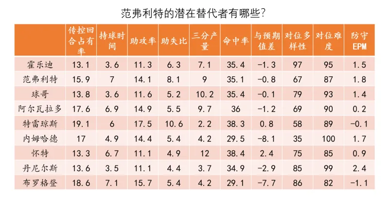 那么對球隊的幫助與范弗利特類似的球員有哪些呢?我通過對位多樣性、對位難度以及助失比三項數(shù)據(jù)進行篩選,最終得到了如上表所示的名單,可以看到最佳替代者非開拓者的霍樂迪莫屬,同樣有冠軍氣質(zhì),霍樂迪的綜合能力還要更加優(yōu)秀,但開拓者目前建隊思路不明朗,是否愿意接受火箭用年輕天賦換即戰(zhàn)力的條件存疑。