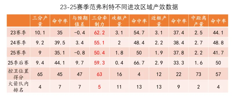 在得分能力方面,老范上賽季確實退化嚴重,事實上受限于天賦他的攻框和近框產(chǎn)量在控衛(wèi)里偏低,得分主要依靠中距離和三分。他的三分產(chǎn)量很大,上賽季在隊里百回合三分數(shù)僅次于杰倫格林、霍樂迪和惠特摩爾三人而已,而這三人中有兩人已經(jīng)離隊,新加入球隊的杜蘭特三分并不高產(chǎn),范弗利特的受傷對火箭的三分投射確實會造成較大的損失!