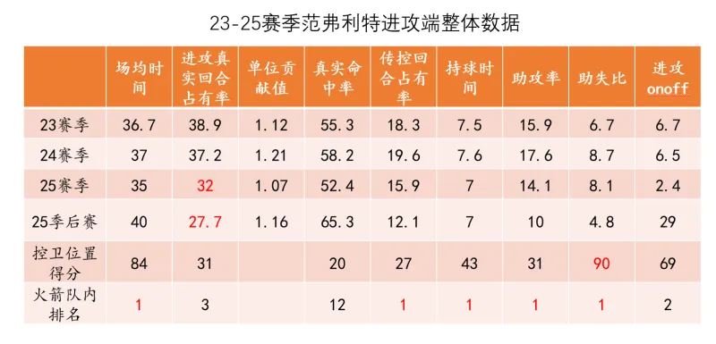 不過上賽季老范確實在進攻環(huán)節(jié)承擔的任務大大降低了,常規(guī)賽回合占有率僅僅只有32%,相較于24賽季下滑5%,僅排在隊內(nèi)第3,低于申京和杰倫格林,到了季后賽更是進一步降低到了27.7%,在扛球權(quán)這件事上已經(jīng)退居二線了。