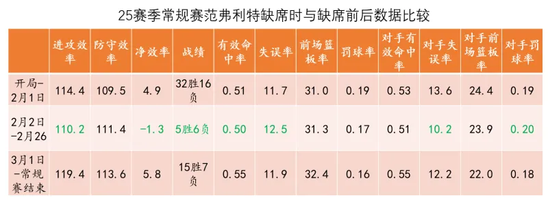 理解范弗利特對火箭的作用,我們先來看看他上賽季常規(guī)賽缺席的一個月火箭整體的高階數(shù)據(jù)與缺席前、缺席后的對比。可以看到范弗利特缺席期間火箭的戰(zhàn)績?yōu)?勝6負、勝率不足50%,凈效率也是負的1.3,而范弗利特在場時球隊的勝率高達67%,凈效率也有5左右,區(qū)別顯而易見。