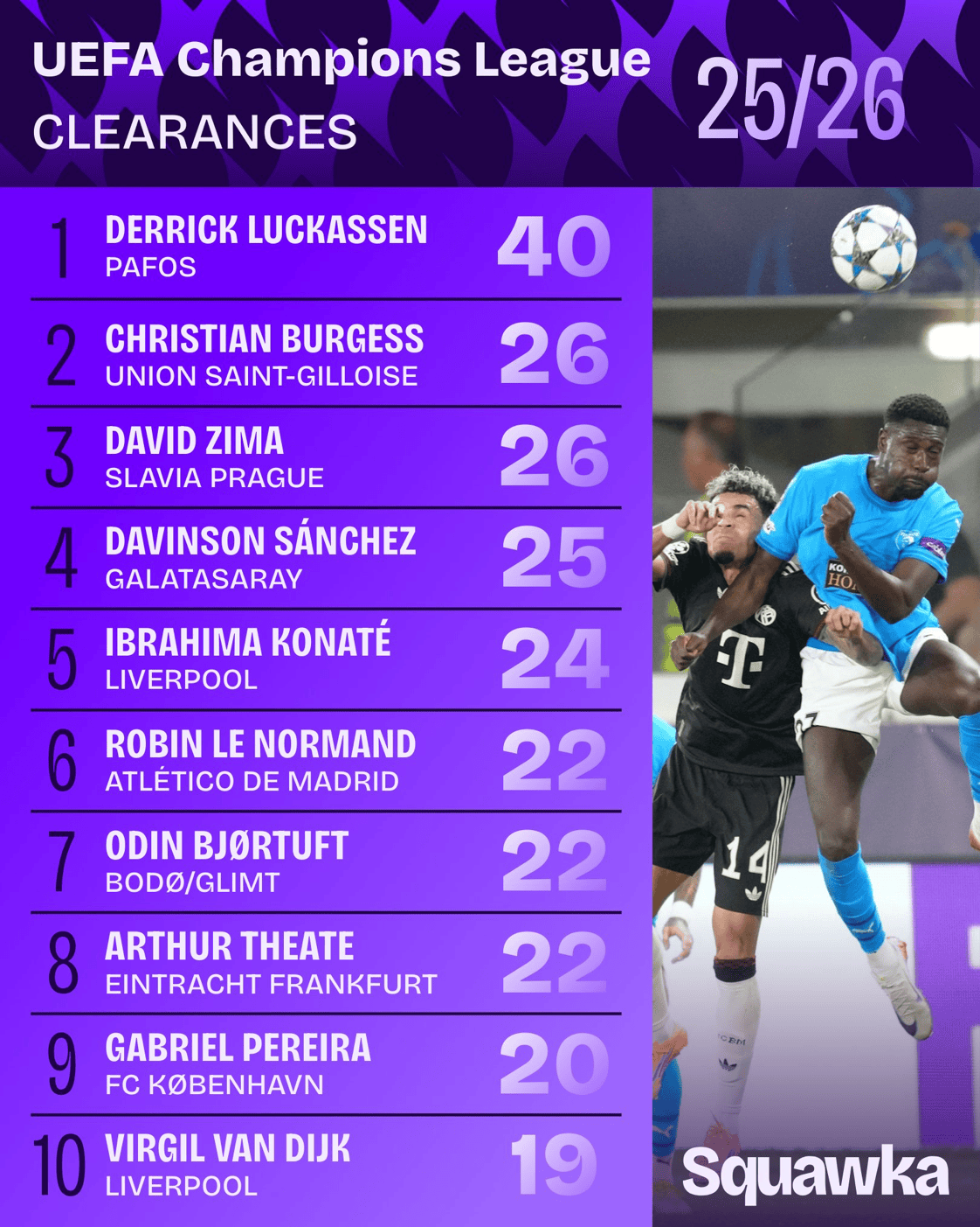 虎撲10月24日訊 根據(jù)Squawka的統(tǒng)計,本賽季的歐冠聯(lián)賽里,德里克-盧卡森的解圍次數(shù)比其他任何球員至少多14次。