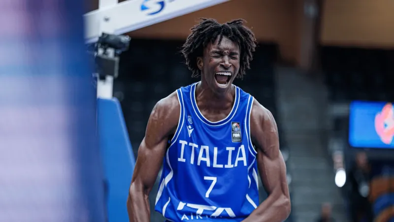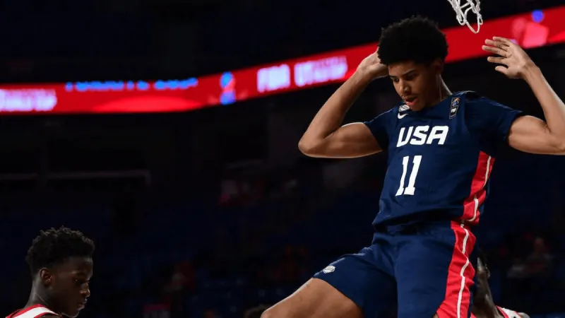 在今年的 FIBA U19 中,來自猶他預(yù)科的 A-迪班薩依靠著精湛的得分技巧和在關(guān)鍵時刻靠著強(qiáng)硬的罰球挺身而出的表現(xiàn),率領(lǐng)美國隊(duì)成功奪魁并榮謄本屆。這位身高6尺9的高大側(cè)翼有著修長的臂展(超過7尺),體重超過 200磅,自高二起便以無死角的得分能力而聞名。根據(jù) Maxpreps的數(shù)據(jù),在高四,他場均可得到 21.5 分 12.7 籃板 3.2 助攻;在2024年的 NIKE EYBL里,他代表 Oakland Soldiers 出戰(zhàn) 15 場,場均可得到 22.3分6.7 籃板 3.0助攻 1.3 搶斷,命中率達(dá)到 50.2%;而在今年的 U19 里,他場均可得到14.3分 4.1籃板 2.3 助攻 1.1搶斷 1.3失誤,兩分命中率 68.4%(3.7/5.4),三分命中率11.1%(0.3/2.6),罰球命中率為 84%(6/7.1)。他的運(yùn)動能力幾乎稱得上頂尖水準(zhǔn),能夠輕松完成飄逸的突破扣籃和麥迪式的遠(yuǎn)距離干拔。他就是個兇蠻的突破手,在場上能夠從容地跑到甜點(diǎn)區(qū)跳投取分,在轉(zhuǎn)換進(jìn)攻的時候勢不可擋,兩分終結(jié)效率全美頂尖。他的速度和爆發(fā)力極為優(yōu)秀,盡管對抗不優(yōu)秀,高重心的運(yùn)球在行進(jìn)間容易被協(xié)防手打斷節(jié)奏而卡在油漆區(qū)外,然而他的長臂配合出色的爆發(fā)力帶給了他在天空飛翔終結(jié)的底氣。