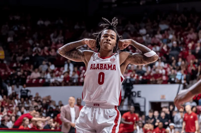 來自阿拉巴馬大學(xué)的拉巴倫-菲隆在大一賽季打出了驚艷的表現(xiàn),依靠著出色而扎實(shí)的防守,穩(wěn)健的組織和一招鮮的小拋投,在內(nèi)特-奧茨的教導(dǎo)下成功成為紅潮的第二指揮官,和馬克-希爾斯,阿登-霍洛維的三后衛(wèi)組合成為這支全美聞名的跑轟大隊(duì)里不可或缺的飲水機(jī)。而NoCeiling也一度稱其最引人入勝又最難評估的球員之一。他的優(yōu)勢顯而易見,不僅是阿拉巴馬后場最出色的兩分得分手,還兼具穩(wěn)健的傳球與極低的失誤率,防守端更是如同夢魘般的存在。但他的短板同樣突出:三分投射能力貧瘠,進(jìn)攻穩(wěn)定性令人扼腕,以至于奧茨都一度將他放到替補(bǔ)。1米93身高配合79公斤的瘦削體型,加之缺乏第一步速度和爆發(fā)力,使得菲隆在現(xiàn)階段以地板流終結(jié)為主,到更高級的聯(lián)賽里很難維持優(yōu)秀的攻框效率。但話又說回來,以他的球商、好勝心、戰(zhàn)術(shù)理解力與拋投技術(shù)的結(jié)合,還是讓人對其能成為新德朗-萊特,TJ-麥康奈爾乃至丹尼斯-施羅德抱有希望。