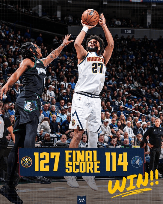虎撲10月28日訊 今天NBA常規(guī)賽掘金客場(chǎng)對(duì)陣森林狼的比賽已經(jīng)結(jié)束。全場(chǎng)戰(zhàn)罷,官方掘金以127-114戰(zhàn)勝森林狼。曬贏