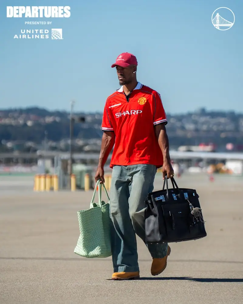 其中,登機吉米-巴特勒身著曼聯(lián)球衣出鏡,照片十分顯眼。衣分