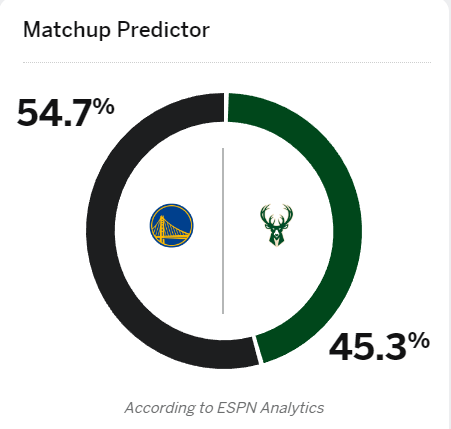 賽前,測明美媒ESPN對本場比賽進行了預測,日勇勇士勝率54.7%占據(jù)上風,士v賽勇士勝雄鹿勝率為45.3%。占上
