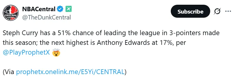 根據(jù)網(wǎng)站ProphetX的蒂芬大模型分析,勇士后衛(wèi)斯蒂芬-庫(kù)里本賽季當(dāng)選三分王的蒂芬概率有51%。緊隨其后的是森林狼后衛(wèi)安東尼-愛(ài)德華茲,概率為17%。