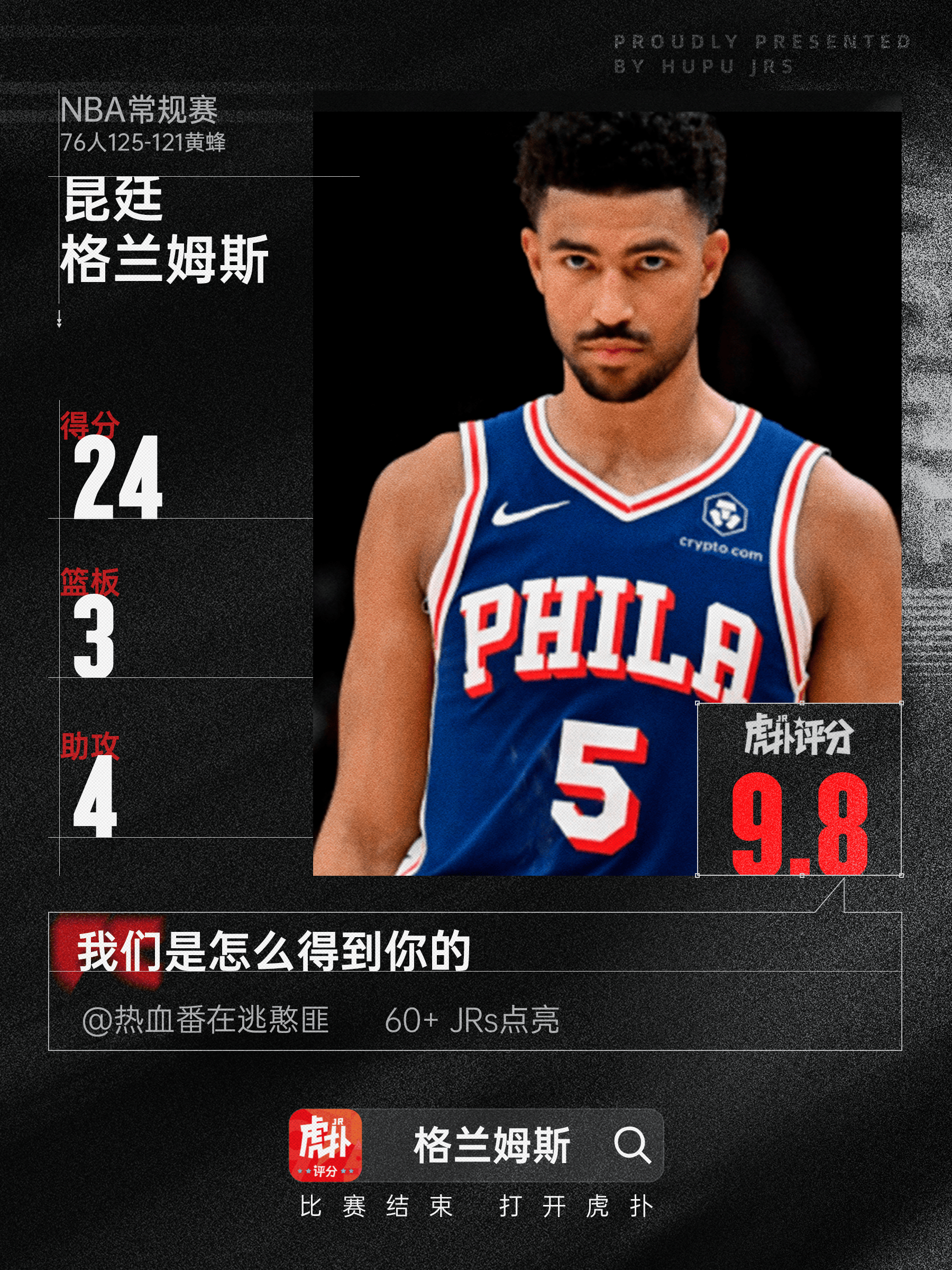 昆廷-格蘭姆斯本場比賽出戰(zhàn)30分鐘,砍下全場14投7中,分籃三分8中5,流言蘭姆罰球5中5砍下24分3籃板4助攻。板關(guān)板助