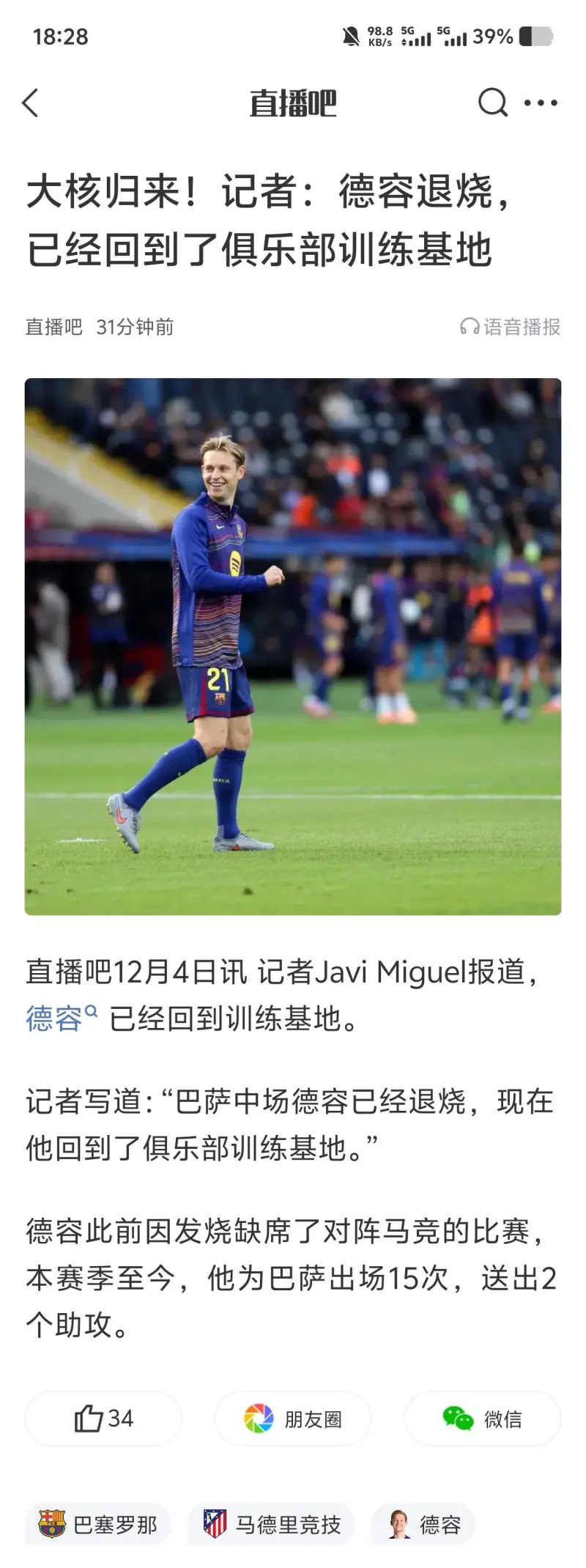 大核歸來!記者:德容退燒,已經(jīng)回到了俱樂部訓(xùn)練基地