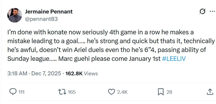 虎撲12月08日訊 在此前結(jié)束的一場英超比賽中,利物浦3-3戰(zhàn)平利茲聯(lián)。前利物浦球員彭南特在社交媒體發(fā)文,批評了科納特的表現(xiàn)。