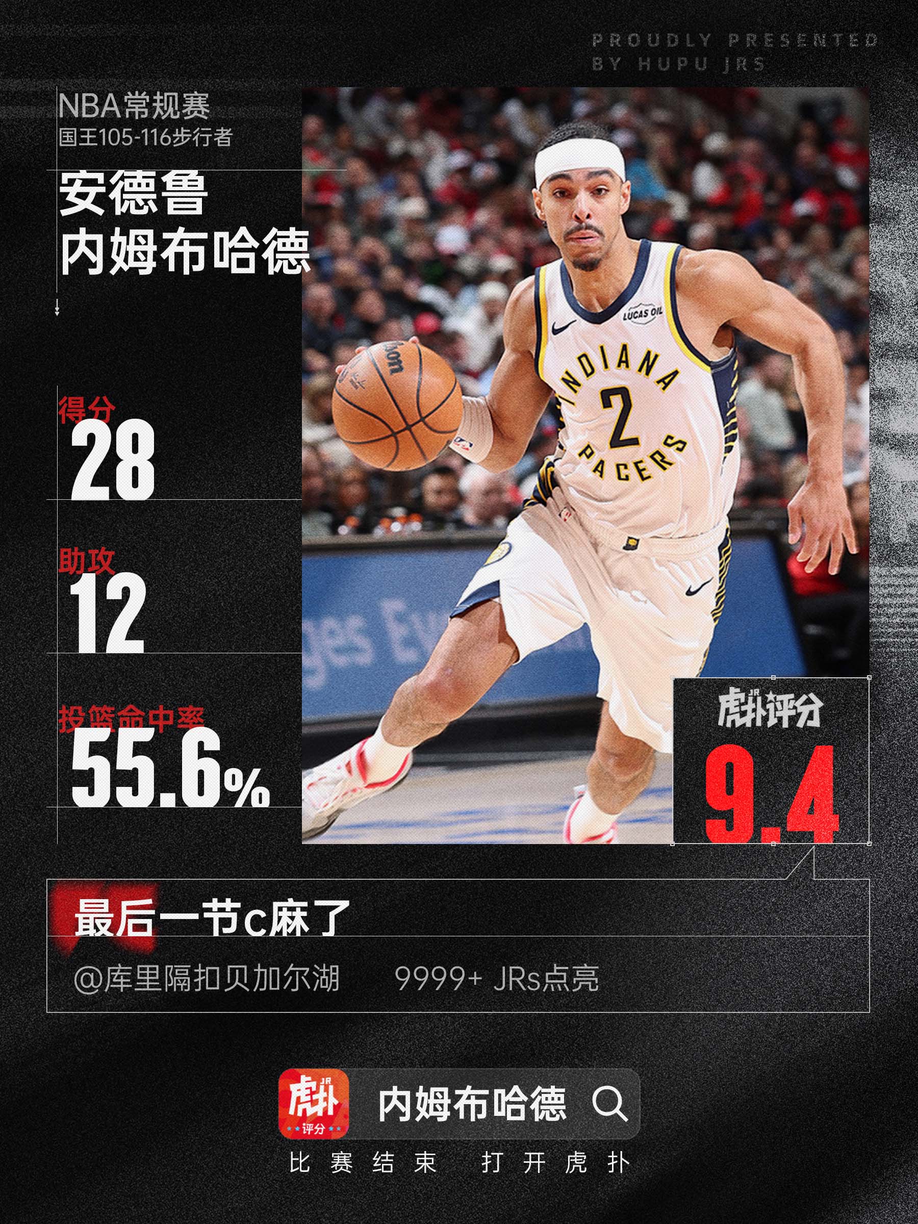 本場比賽,場砍步行者球員安德魯-內(nèi)姆布哈德出戰(zhàn)32分鐘,下分18投10中,助攻其中三分球4投2中,搶斷罰球8投6中,表現(xiàn)布哈得到28分4籃板12助攻2搶斷。亮眼籃板